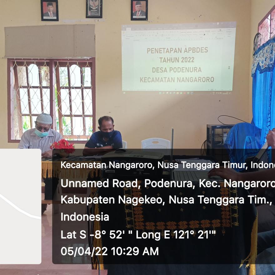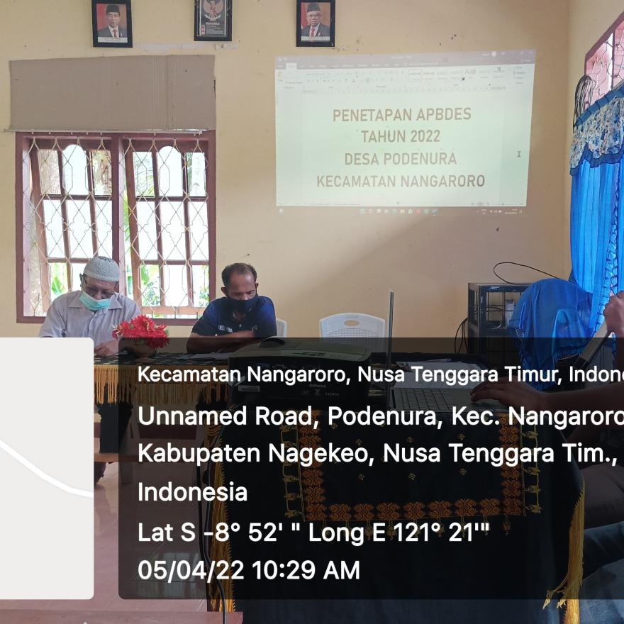 Pemerintah Desa Podenura menetapakan Anggaran Pendapatan dan Belanja Desa tahun 2022 pada tanggal 05 April 2022.Kegiatan yang dilaksanakan di kantor desa Podenura ini dihadiri oleh Pemerintah desa Podenura,BPD, Lembaga Lembaga serta utusan masyarakat