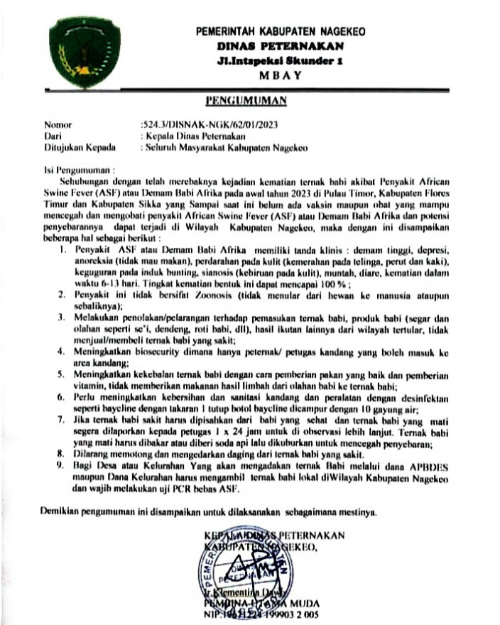 Ia mengatakan pihaknya telah mengetahui bahwa kematian babi akibat penyakit ASF mulai kembali marak di awal tahun 2023 di Maumere Kabupaten Sikka, Larantuka dan Pulau Adonara di Kabupaten Flores Timur, Kota Kupang, dan daratan Pulau Timor melalui Pengumuman Dinas Peternakan Kabupaten Nagekeo Nomor :524.3/DISNAK.NGK/62/01/2023. Oleh sebab itu, kata dia, warga yang melakukan perjalanan dari daerah-daerah itu masuk ke desa Podenura dilarang membawa ternak, daging, maupun produk olahan lainnya dari babi.