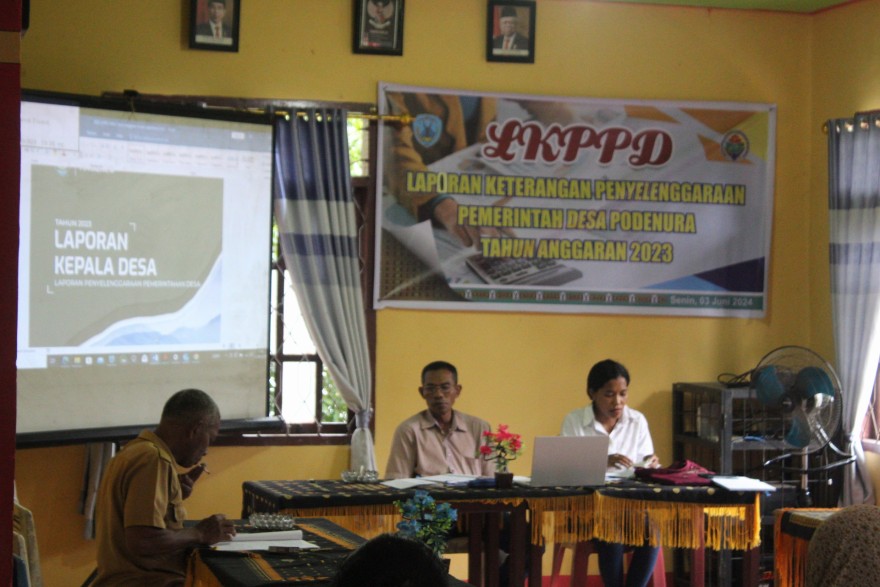 Dalam penyampaian LKPPD, Sekretaris Desa Podenura Selvianus Waka menyampaikan informasi tentang pelaksanaan tugas-tugas pokok dan fungsi pemerintahan desa selama tahun anggaran 2023. Ini mencakup aspek aspek seperti Penyelenggaraan Pemerintah Desa,Pembangunan Desa,Pembinaan Kemasyarakatan Desa,Pemberdayaan Masyarakat Desa,Serta Penanggulangan Bencana Darurat Mendesak .