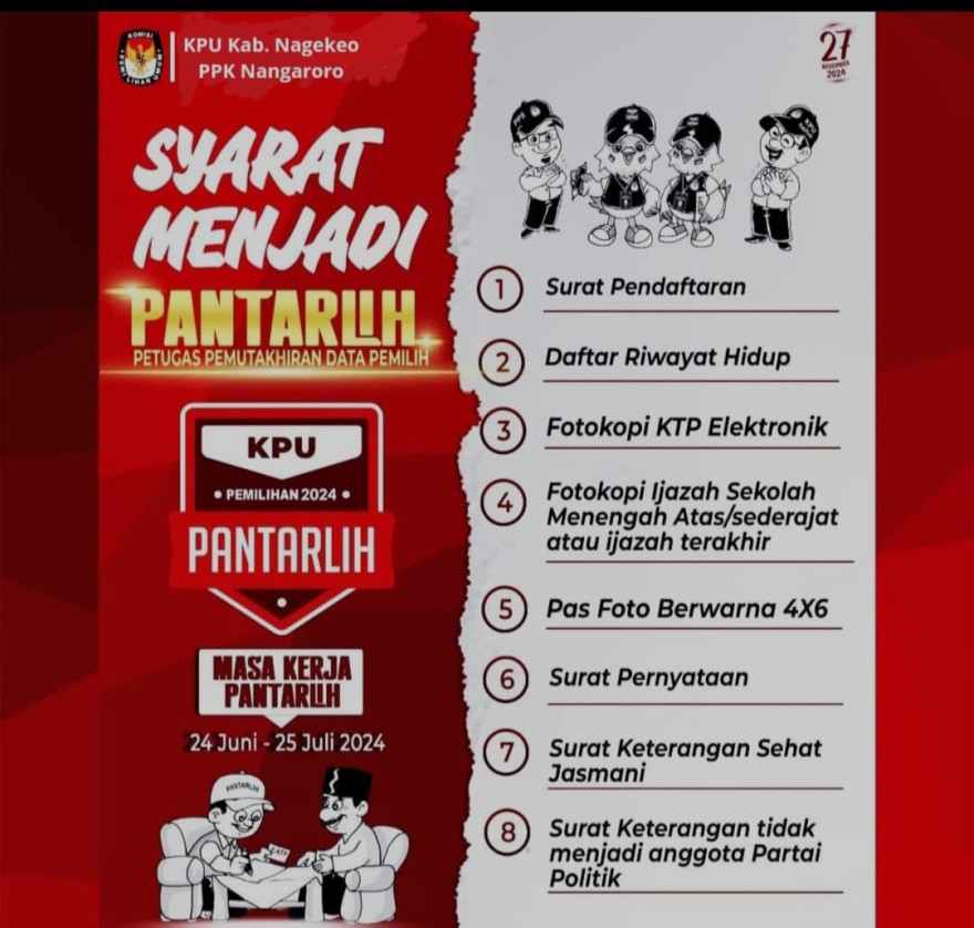 Dalam rangka pembentukan Calon Petugas Pemutakhiran Data Pemilih (Pantarlih) untuk Pemilihan Gubernur Dan Wakil Gubernur Nusa Tenggara Timur Serta Bupati dan Wakil Bupati Nagekeo Tahun 2024, maka Panitia Pemungutan Suara (PPS) Desa Bokong mengundang Warga Negara Indonesia yang memenuhi persyaratan untuk mendaftarkan diri menjadi Petugas Pemutakhiran Data Pemilih (Pantarlih) pada Pemilihan Gubernur Dan Wakil Gubernur Nusa Tenggara Timur Serta Bupati dan Wakil Bupati Nagekeo Tahun 2024, dengan ketentuan sebagai berikut: