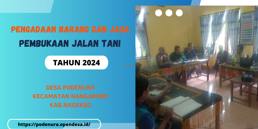 Untuk Kegiatan Pembukaan Jalan Tani tahun 2024 desa Podenura dengan pagu Rp.245.923.700 Pemerintah desa Podenura menetapkan sistem Pengadaan Barang Dan Jasa dengan sistem Lelang dikarenakan pagu anggaran mencapai lebih dari dua ratus juta rupiah .Pengumuman pelelangan dilaksanakan oleh TPK sejak 12 Juni 2024 dan sebanyak tiga Penyedia mendaftarkan diri untuk mengikuti Pelelangan yaitu CV.Mardian, CV Libers dan CV Borneo